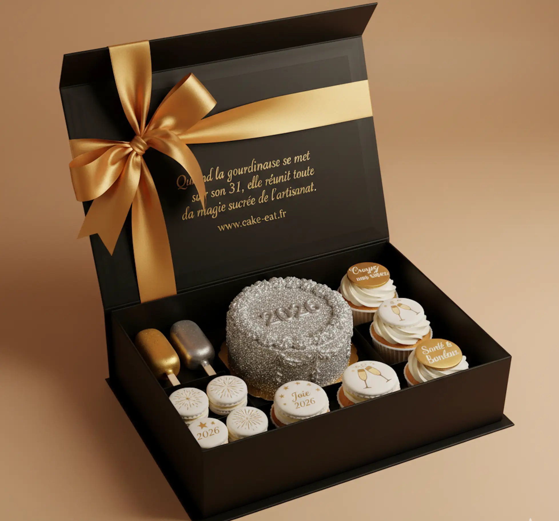 Le Coffret Nouvel An Cake Eat est une invitation à la fête, entre gourmandise et raffinement. Chaque pièce est pensée pour célébrer le passage à la nouvelle année avec chic et plaisir.